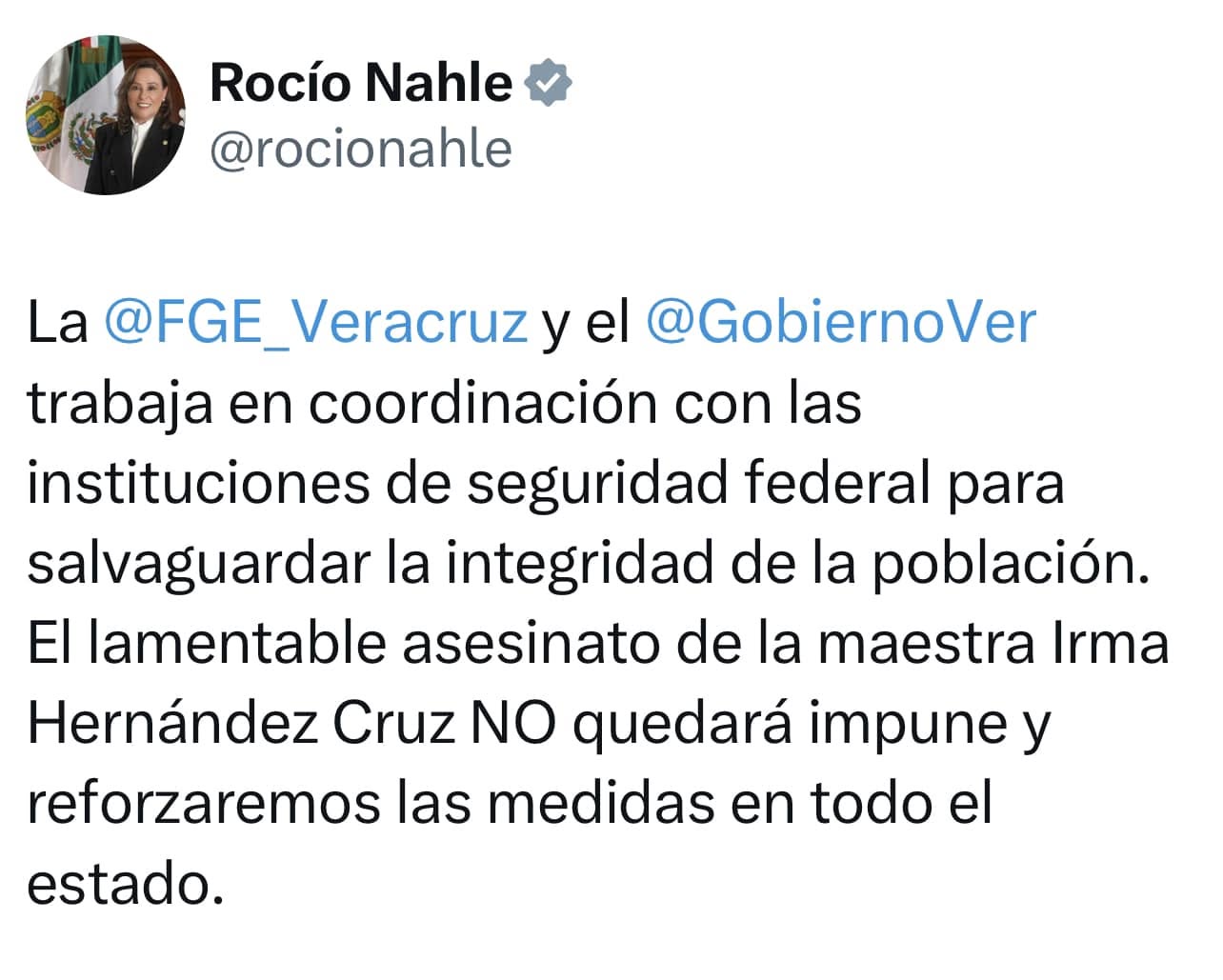 Xalapa, Veracruz. La gobernadora de Veracruz, Rocío Nahle García, condenó públicamente el asesinato de la maestra jubilada Irma Hernández Cruz, ocurrido en el municipio de Álamo Temapache, y aseguró que el crimen no quedará impune.
