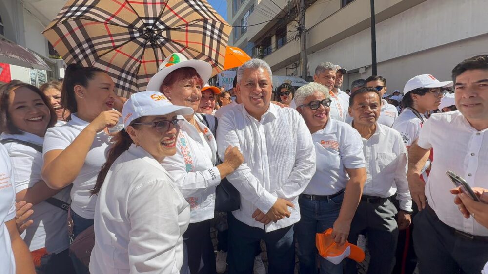 En la vanguardia marcharon los dirigentes actuales del sindicato, encabezados por Juan Nicolás Callejas Roldán, hijo del recordado líder magisterial. A su lado, representantes de distintas delegaciones escolares ondeaban pancartas con la imagen de Callejas Arroyo, símbolo del origen del grupo y de la estructura que durante décadas definió la política educativa en Veracruz.