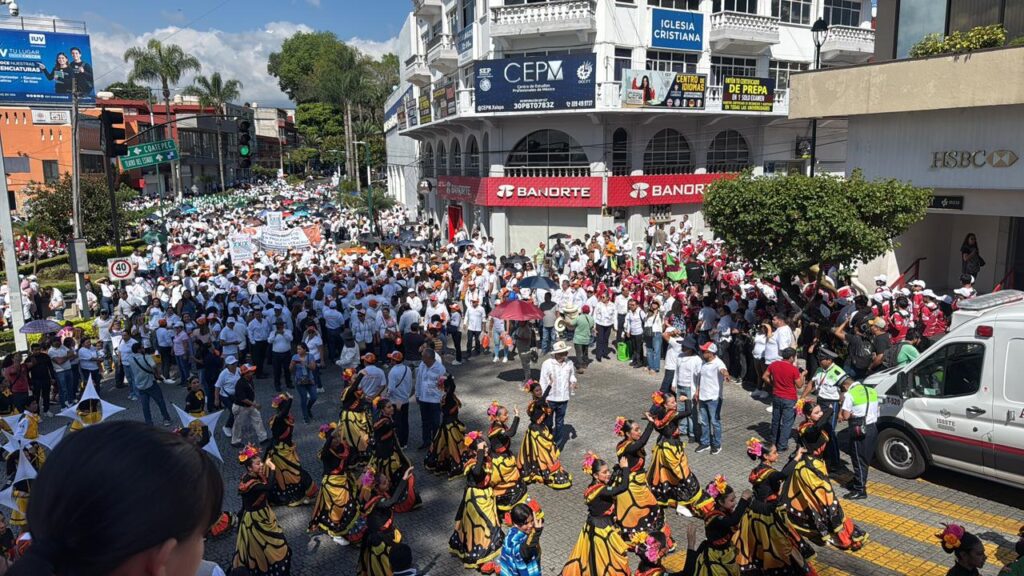 El contingente avanzó por Ávila Camacho, Clavijero, Enríquez, Lucio y Úrsulo Galván, cubriendo con su marcha el centro histórico de la ciudad. En las horas previas y a su paso, el tránsito se detuvo y los comercios bajaron sus cortinas por unos minutos. En el aire se mezclaban el sonido de los tambores, el eco de los aplausos y las voces que repetían el mismo lema: unidad, fuerza y legado.
