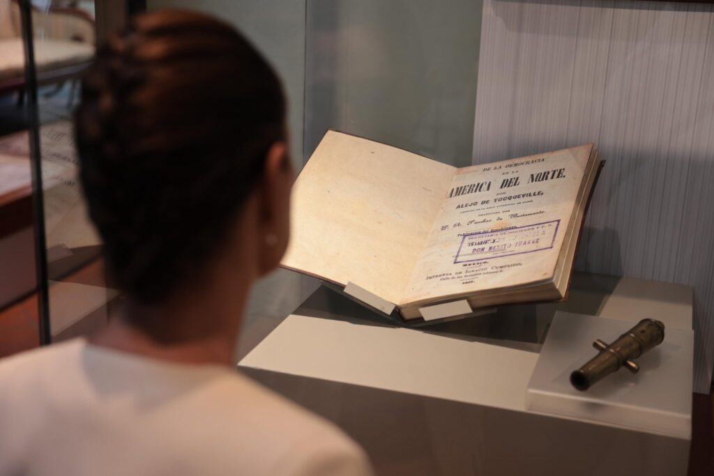 Uno de los objetos destacados es el libro “América del Norte”, firmado por el propio Juárez, visible tras un cristal mientras una visitante —la propia presidenta— lo observa con atención.