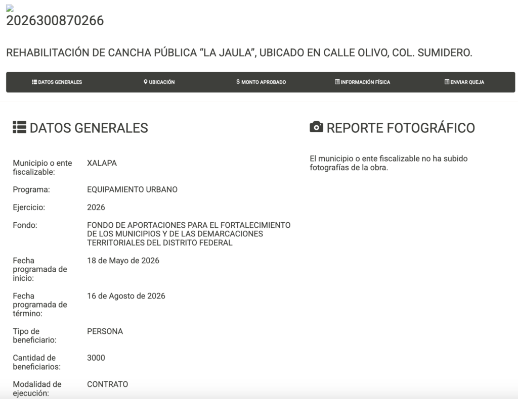 En total, el sistema documenta al menos nueve proyectos de rehabilitación de canchas públicas en colonias como Sumidero, Casa Blanca, Revolución, El Olmo, Ferrocarrilera y Constituyentes.