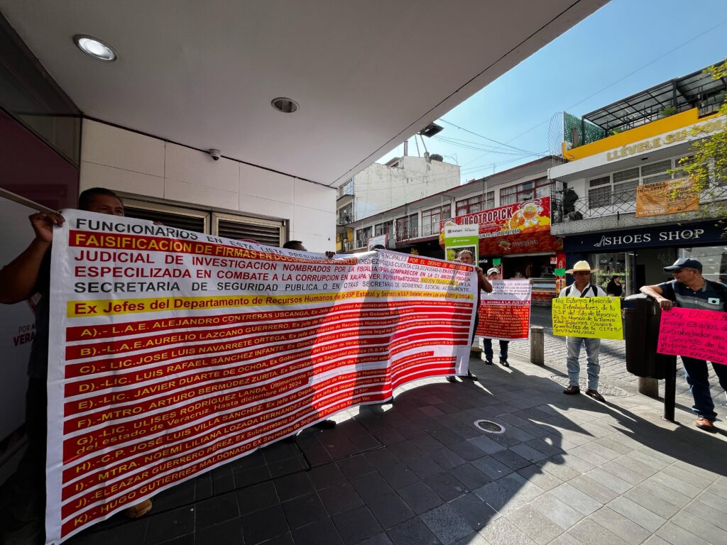 Xalapa, Veracruz. Ex trabajadores de la Secretaría de Seguridad Pública de Veracruz (SSP) se manifestaron en las inmediaciones de esa dependencia ubicada en el centro