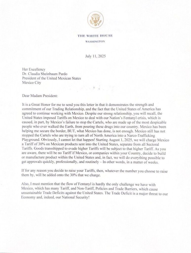 Ciudad de México. El presidente de Estados Unidos, Donald Trump, envió este sábado una carta a la presidenta mexicana, Claudia Sheinbaum, en la que anuncia la